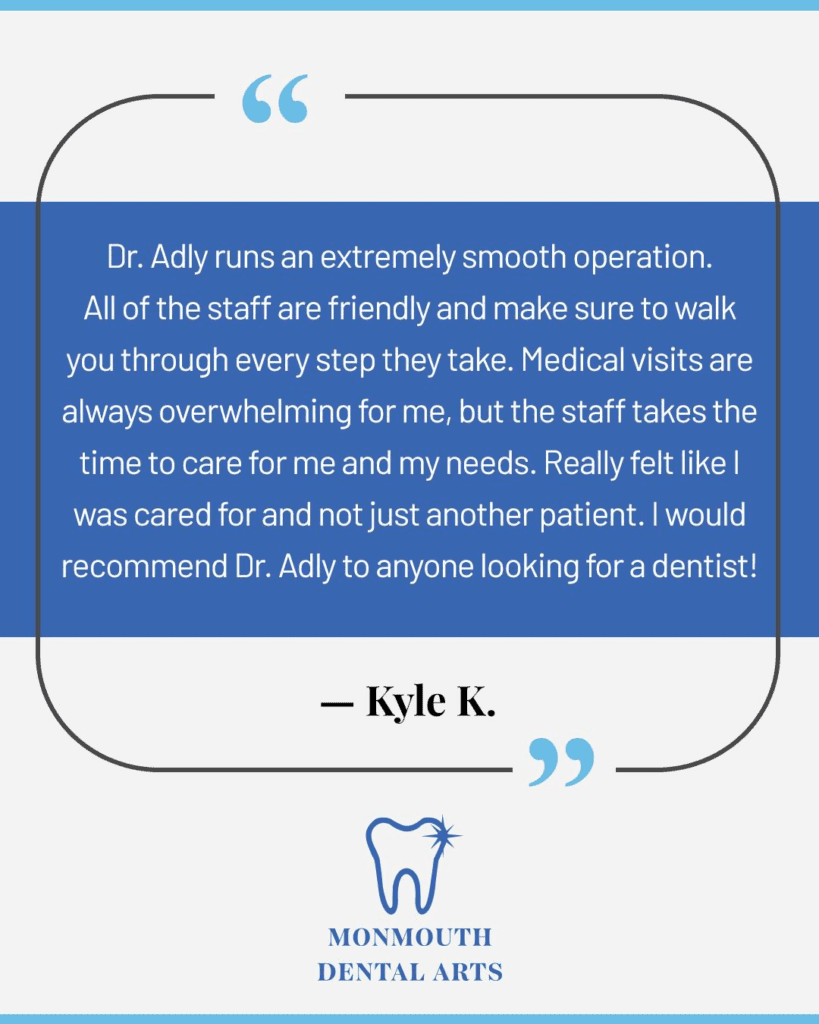 Best dental experience! Staff is very caring asking at all times how I was doing. Dr Adly was amazing explaining everything as he was working and very skillful. Clean exam room with a nice view.