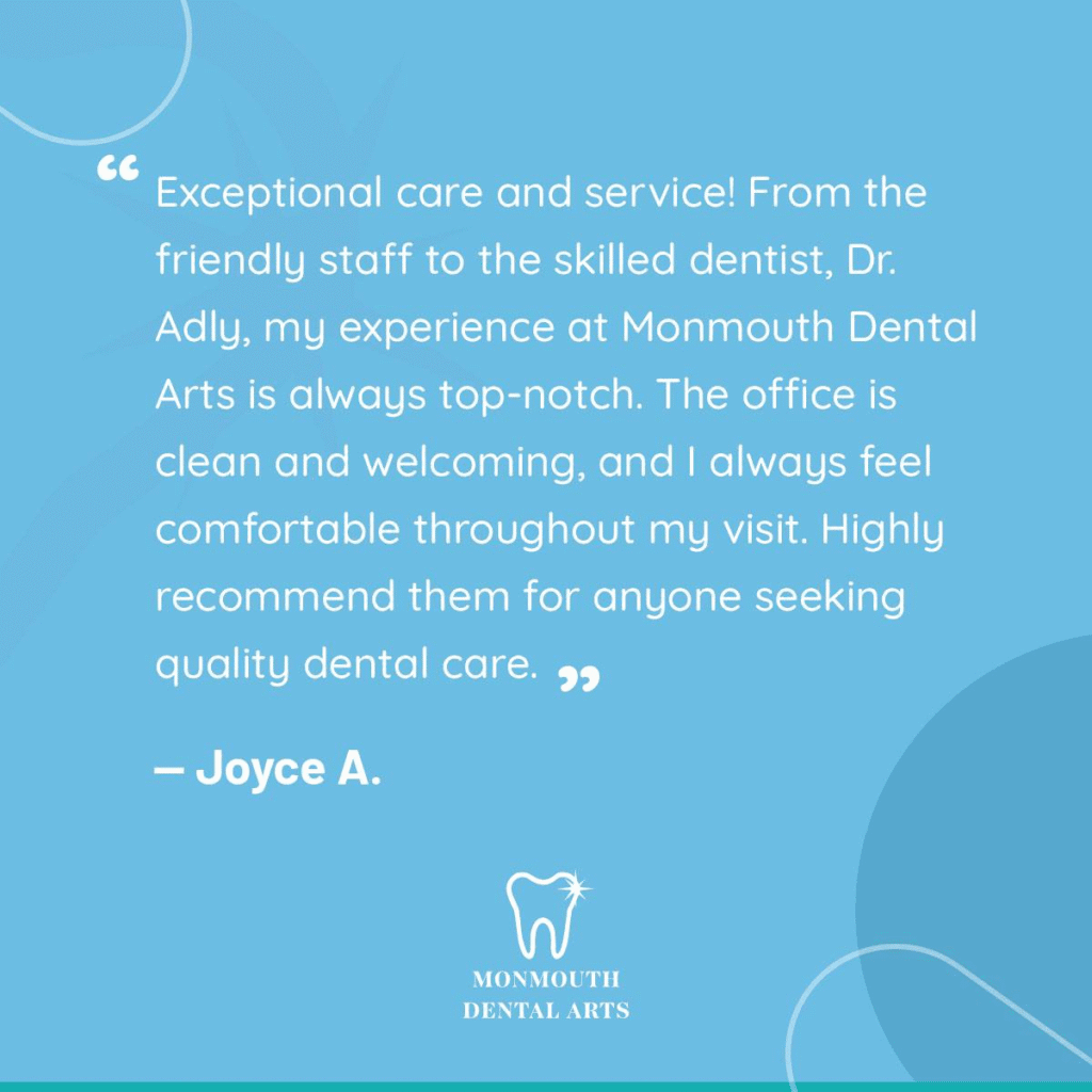 At Monmouth Dental Arts, patients trust Dr. Adly and his experienced team because of their exceptional skill, advanced training, and commitment to personalized care. With years of expertise in cosmetic and restorative dentistry, Dr. Adly understands that every smile is unique and takes the time to answer all your questions, explain your options, and ensure you feel comfortable every step of the way. From the initial consultation to the final results, you’ll know you’re in the hands of a caring team dedicated to precision, artistry, and patient satisfaction. That’s why so many patients turn to Dr. Adly—not just for stunning cosmetic outcomes, but for the peace of mind that comes with being guided by the very best.